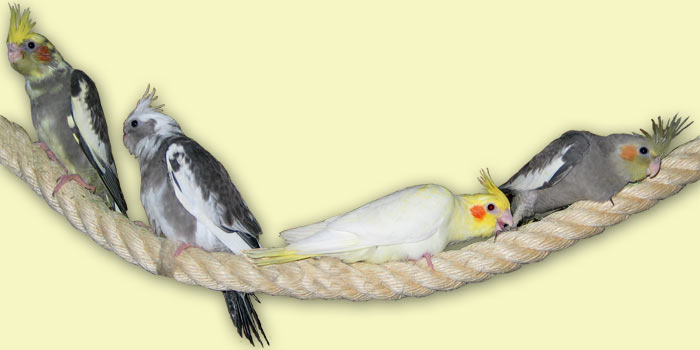 Junge Nymphensittiche, die noch sehr tapsig ihre Umwelt erkunden.