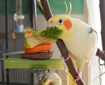 Die Vorlieben sind vielseitig und manchmal dauert es Jahre, bis ein Schwarm freiwillig Obst und Gemüse frisst. Sind Nymphensittiche erstmal auf den Geschmack gekommen, fressen sie mit Begeisterung frische Karotten, Apfel, Paprika, Mais, Gurke, Sellerie, Beeren, Petersilie und vieles mehr.