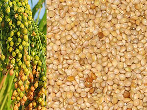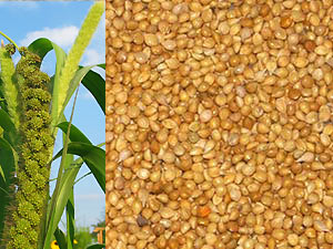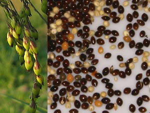 Platahirse (Panicum milliaceum) Eine vergleichsweise große und helle Hirseart. Die Pflanze bildet Samenrispen aus, der Hirseanbau ist auch in Deutschland gut möglich. |