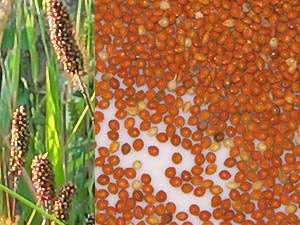 Mannahirse (Setaria italica) ...ist eine sehr kleine rote Hirseart. Sowohl gekeimt, als auch trocken ist sie anscheinend sehr lecker für Nymphensittiche. Beim Anbau im eigenen Garten bringt sie nur sehr kleine Kolben hervor, welche aber trotzdem begeistert gefressen werden. |