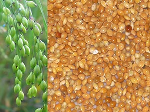 Japanhirse (Echinochloa frumentacea) ...ist eine sehr kleine Hirsesorte mit eckigen Körnern. Japanhirse wird vornehmlich in Ostasien als Nahrungsmittel und in den USA als Futterpflanze angebaut. Die leicht zu entspelzenden Körner werden von Nymphensittichen gut angenommen. |