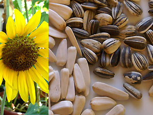 Sonnenblumenkerne (Panicum milliaceum) ... oder kurz SBK. Der Ölgehalt der Samen liegt zwischen 48 und 52%. Damit sind die Kerne echte "Dickmacher". Sie enthalten dabei aber hauptsächlich ungesättigte Fettsäuren. Weiterhin sind viele wichtige Aminosäuren, Mineralstoffe, Vitamine und Spurenelemente enthalten. In Maßen gefüttert sind Sonnenblumenkerne beliebte und gesunde Leckerbissen. Für frische halbreife Samen noch im Blütenkorb lassen viele Nymphensittiche Kolbenhirse liegen. Wer die Möglichkeit zum Anbau hat, sollte dies unbedingt nutzen. Sonnenblumenpflanzen sind sehr pflegeleicht. |