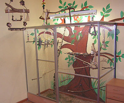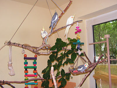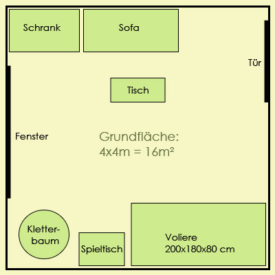 In dem 16m²-Zimmer leben zur Zeit sechs Nymphensittiche die täglich von 8 bis 20 Uhr Freiflug haben. Nachts sind sie aus Sicherheitsgründen in der Voliere (Nachtschreckgefahr). Das Licht der Vogellampe ist in dieser Zeit ebenfalls in Betrieb (eine 120 cm Arcadia Birdlamp). Zusätzlich ist noch eine kleinere UV-Lampe über dem Kletterbaum geplant, da die Wirkung der wichtigen UV-Strahlen der Vogellampe ab ca. 50 cm stark abnimmt und sie sich tagsüber vorwiegend außerhalb der Voliere aufhalten.