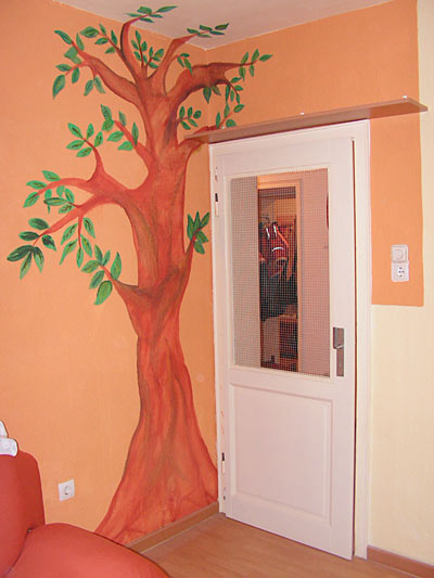 Die Bilder auf den Wänden sind mit ungiftigen Kinderfarben gemalt. Das ist wichtig, da die Nymphies die Tapete anknabbern können und dies leider auch fleißig machen. Im Zimmer befinden sind keine Zimmerpflanzen, da die meisten für Sittiche giftig sind. Pflanzen hätten ohnehin keine lange Überlebenschance.