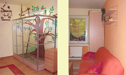 Links: Voliere, Rechts: Couch zum gemütlichen Beobachten