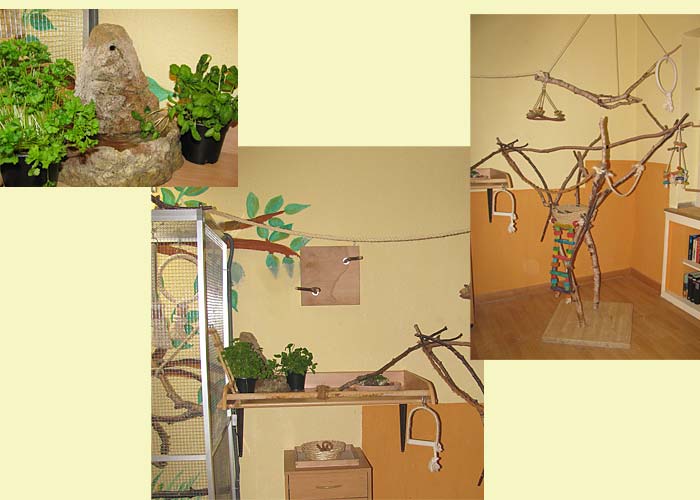 Das Zimmer ist vogelsicher, das heißt es sind keine elektrischen Leitungen zugänglich. Die Kabel der Vogellampe und des Brunnens verlaufen in einem Hartplastikschlauch. Es gibt keine Ecken oder Spalten in die die Nymphies fallen und sich einklemmen könnten (fatal bei Abwesenheit des Halters!).