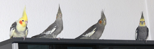 Schon mit 3 Jahren waren Vögel für mich faszinierende Tiere. Im Winter saß ich oft vor dem Fenster und beobachtete sie am Futterhaus. Das Interesse für Vögel aller Art ließ im Laufe der Jahre nicht nach, und ich bin in meiner Freizeit oft draußen anzutreffen. Doch nicht nur Steinkäuze und Halsbandschnäpper haben es mir angetan. Schon immer wollte ich auch Vögel halten, doch meine Eltern waren dagegen. Bis mir mit 13 Jahren ein blauer Wellensittich zuflog, dessen Besitzerin ihn nicht mehr zurück haben wollte. Schnell zog ein Weibchen für ihn ein und die Dinge nahmen ihren Lauf. Eines Tages bekam ich Federn einiger Nymphensittiche und war von der Vielfalt der Farbschläge begeistert. Besonders schön fand ich die Schwanzfedern der Weißkopf-Hennen. Doch da ich wusste, dass ein Nymphensittich-Paar viel anspruchsvoller ist als ein Wellensittich-Paar und auch der Platzbedarf größer ist, musste ich einige Jahre warten, bis ich mir über Nymphensittiche als Mitbewohner Gedanken machen konnte. 2004 zog ich dann mit meinem Freund in eine eigene Wohnung, und wir überlegten lange, ob die kleinen Kakadus zu uns passen.