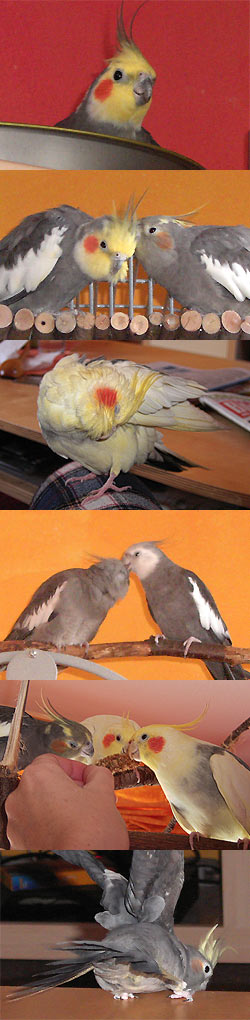 Natürlich sollte sie nicht alleine bleiben und so zog Woodstock bei uns ein. Leider verstarb Flori kurze Zeit später, aufgrund eines nicht vogelkundigen Tierarztes. Astrid zog nun bei uns ein. Wir hatten uns für 2 Hennen entschieden, da wir keine Küken haben wollten. Zwei Jahre ging die Frauengemeinschaft gut, bis Woodstock sich einen "Körner hochwürgen und wieder auffressen" - Tick angewöhnte. Uns war klar, dass unsere Damen endlich Herren brauchten. Daraufhin zog zuerst Justus und kurze Zeit später Caruso bei uns ein. Leider verstarb Caruso im Juli 2006 und nach einigem Chaos kam Finn im Januar 2007 zu uns. So wurden dann aus zwei Nymphies vier und es bildeten sich zwei wunderbare Paare. Dabei sollte es eigentlich auch bleiben, bis zum Februar 2007. Einer Bekannten war ein Nymphie zugeflogen und nach einer Woche rief sie völlig genervt bei mir an. Ja - und so zog unser fehlgeprägter Michel bei uns ein. Und da er auch eine Frau bekommen sollte, kam noch Lina, ebenfalls menschenfixiert.