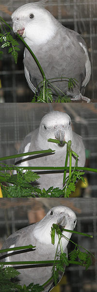 Eine Notaufnahme brachte dann im Dezember 2006 die ca. 10-jährigen Nymphies Hanny (Schecke) und Heino (Lutino) in den Minischwarm. Leider hatte Hanny sich angewöhnt, Heino zu rupfen. Da sie aber schon ihr ganzes Leben zusammen sind, will ich jetzt versuchen, das Fremdrupfen durch sehr viel Abwechselung, optimale Haltungsbedingungen und ein Leben im Minischwarm zu stoppen. Da Emilie und Pauli wohl aufgrund der Fehlprägung von Emilie kein Paar wurden, zog am Ostersamstag 2007 die 9 Monate alte WK-Zimt-Henne Lilu bei uns ein.
