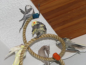 Unser Wohnzimmer ist mehr und mehr zum Vogelzimmer mutiert. Statt Vorhänge zieren Hanfstrickgebilde das Balkonfenster, die Blumenampel wurde durch eine Hanfspirale ersetzt und Zimmerpflanzen wurden durch ungiftige Vogelmiere oder Golliwoog ausgetauscht.
