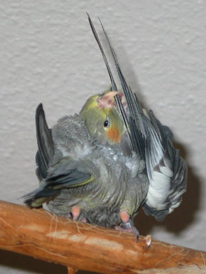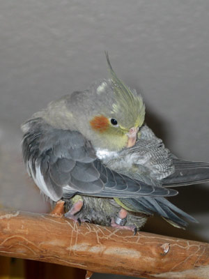 Das Kopfkratzen kann man bei Nymphensittichen sehr häufig beobachten. Der Hinterkopf ist für den Schnabel unerreichbar, also behelfen die Vögel sich mit den Krallen. Dazu wird ein Flügel abgesenkt, das Bein der gleichen Seite von hinten über den Flügel gehoben und der Kopf entsprechend zur Seite geneigt. Diese umständliche Verhaltensweise ist angeboren und steht im Gegensatz zu den Kakadus, welche sich "vorne herum" kratzen.